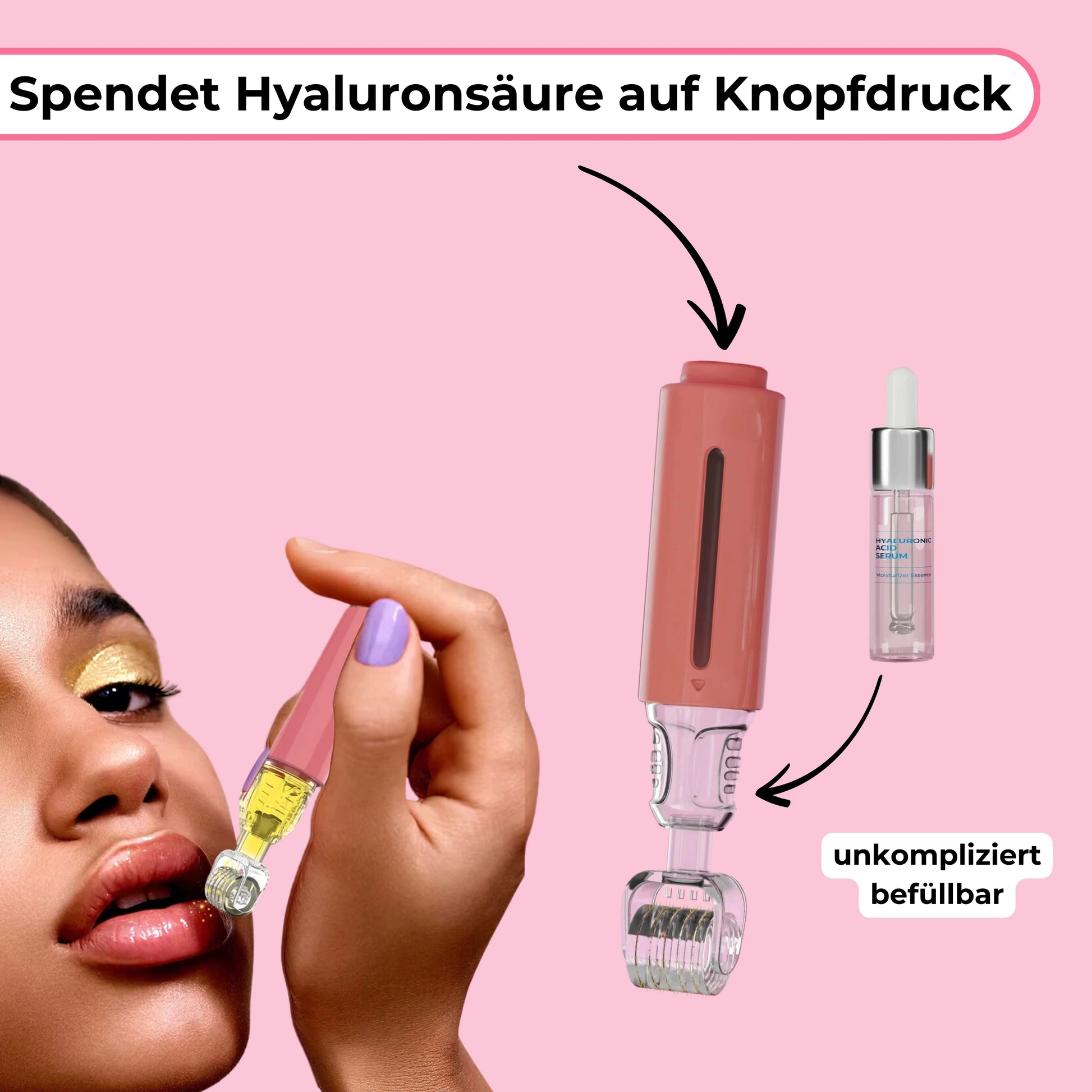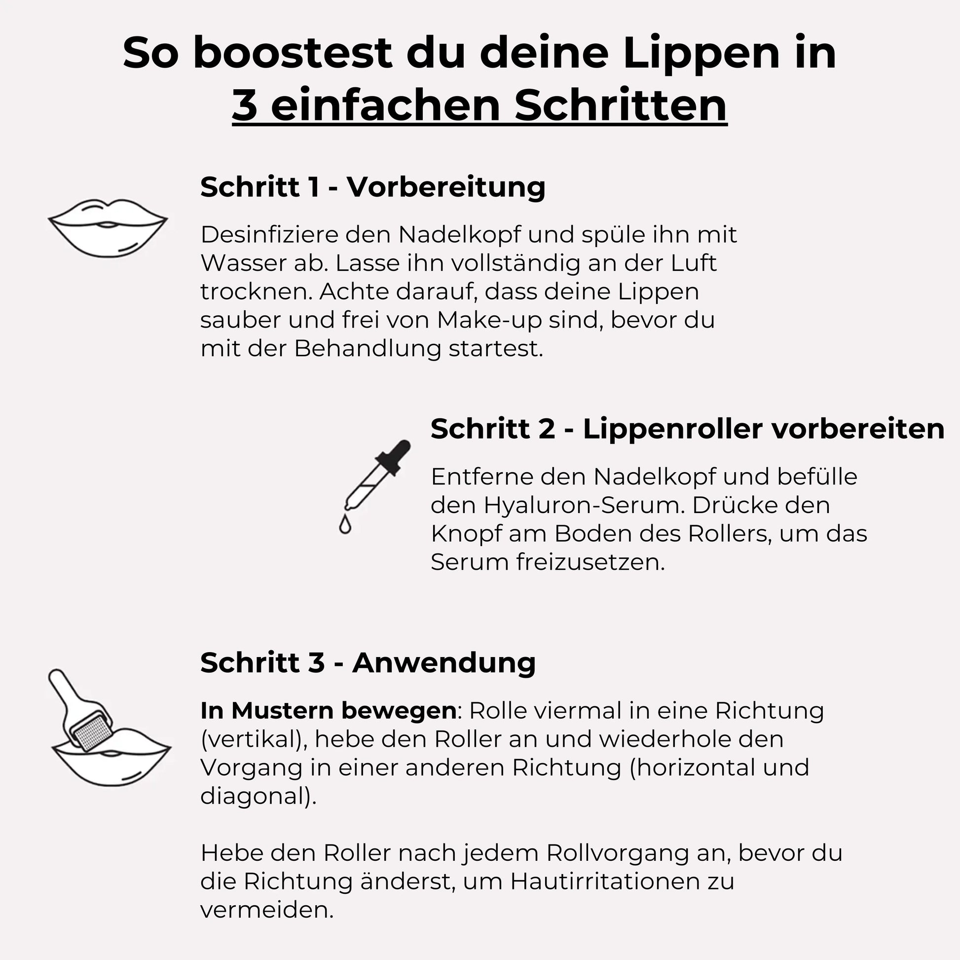 Dank der kraftvollen Kombination aus Mikro-Needling und Hyaluron-Serum, einer Methode, die auch von Kosmetiker:innen genutzt wird, wird die Kollagenproduktion angeregt und deine Lippen werden auf natürliche Weise voller und voluminöser.